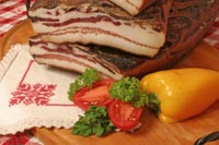 Najboljše svinjsko meso, slanina, jedilna sol, česnova voda in različne začimbe po lastnih receptih. S prekajenjem z bukovimi drvi dozori v poslastico stare tradicije.