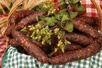 Najboljše svinjsko meso, slanina, jedilna sol, česnova voda in različne začimbe po lastnih receptih. Suhe klobase so rahlo prekajene z bukovimi drvi.